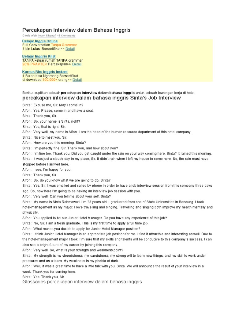 Percakapan interview dalam bahasa inggris 4 march 2021 2 december 2012 by imam khanafi berikut cuplikan sebuah percakapan interview dalam bahasa inggris untuk sebuah lowongan kerja di hotel. I am the head of the human resource department of this hotel company. Halo para sahabat sbi 🙂 tips kali ini kami ambil dari buku karangan. Contoh pertanyaan interview di hotel. Pertanyaan dan jawaban untuk interview kerja bahasa inggris.